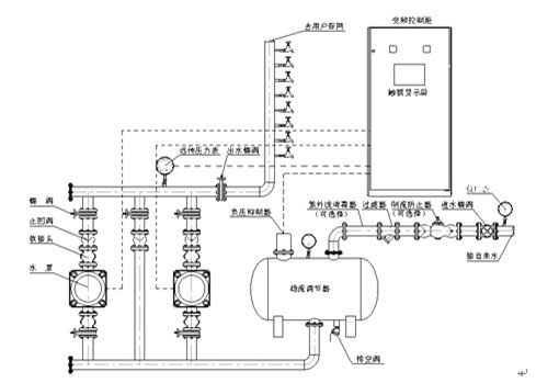 RWG系統(tǒng)智能型無負(fù)壓變頻供水設(shè)備是由穩(wěn)流調(diào)節(jié)器、負(fù)壓抑制器、水泵機(jī)組、智能變頻控制柜、遠(yuǎn)傳壓力表、各種閥門管件等組成。其原理圖如下所示。
