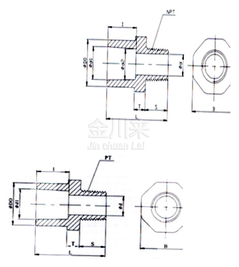 | Size | Do | d1 | d2 | I | d | T | S | L | B | NPT |