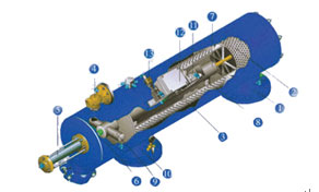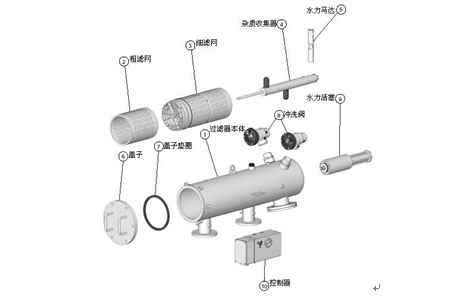 水力驅(qū)動(dòng)自清洗過(guò)濾器由主管組件、端蓋組件、細(xì)濾芯組件、粗濾芯組件、吸污器組件、水力馬達(dá)、水力缸組件、排污閥、管路控制系統(tǒng)等主要零部件組成。水由入水 口進(jìn)入過(guò)濾器,首先經(jīng)過(guò)粗濾芯組件濾掉圈套顆粒的雜質(zhì),然后到達(dá)細(xì)濾網(wǎng),通過(guò)細(xì)濾網(wǎng)濾除細(xì)小顆粒的雜質(zhì)后,清水由出水口排出。